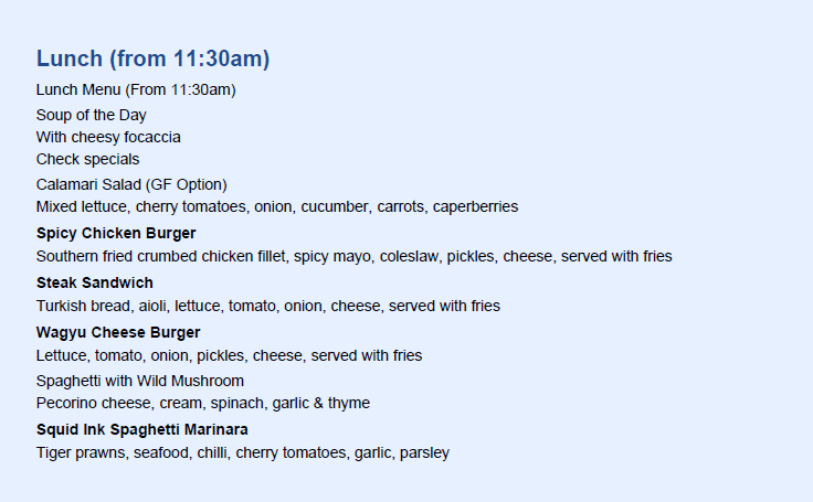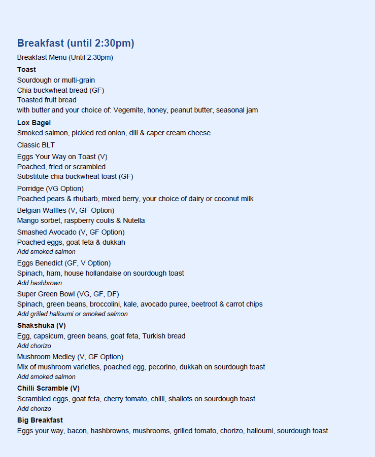 This menu structure supports various dining occasions including breakfast, coffee breaks, and light meals, accommodating both quick orders and more relaxed dining experiences.